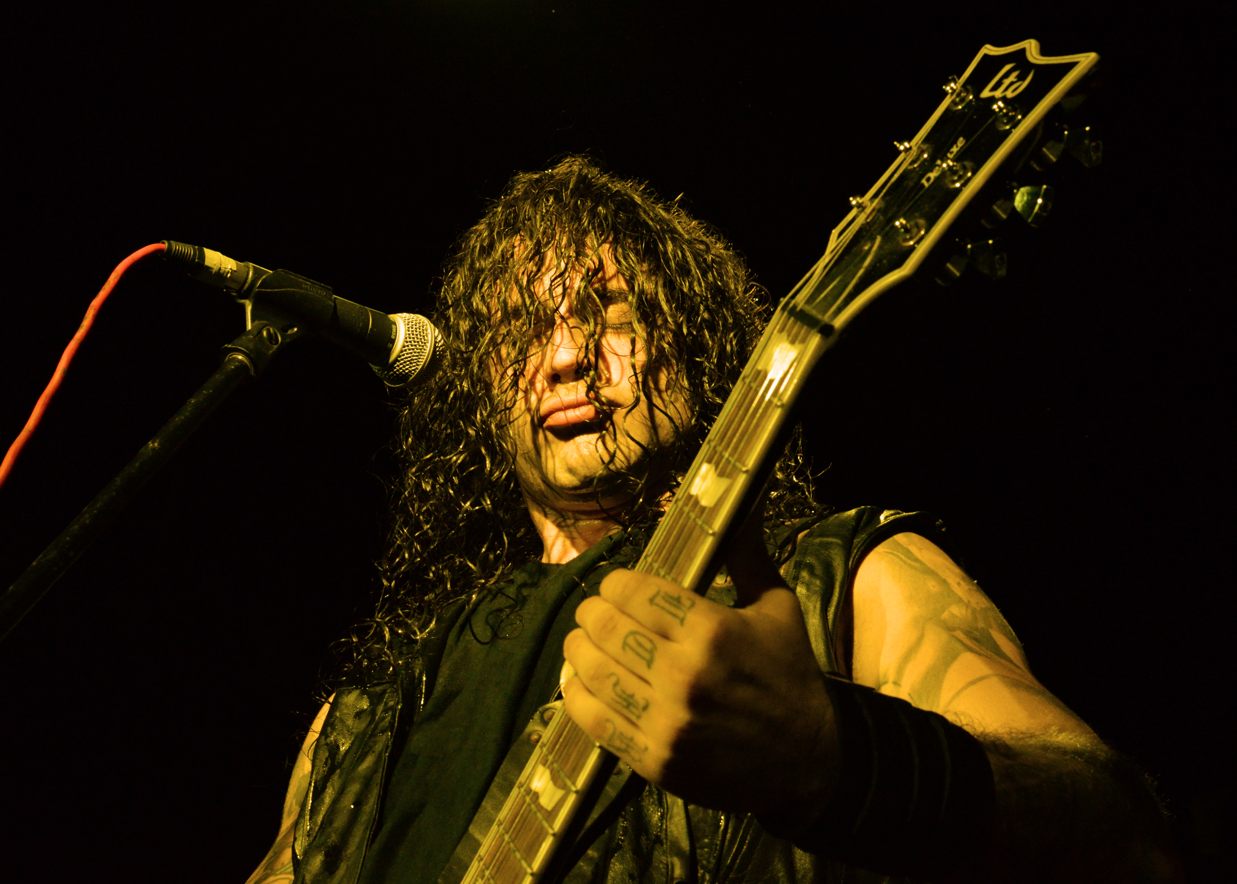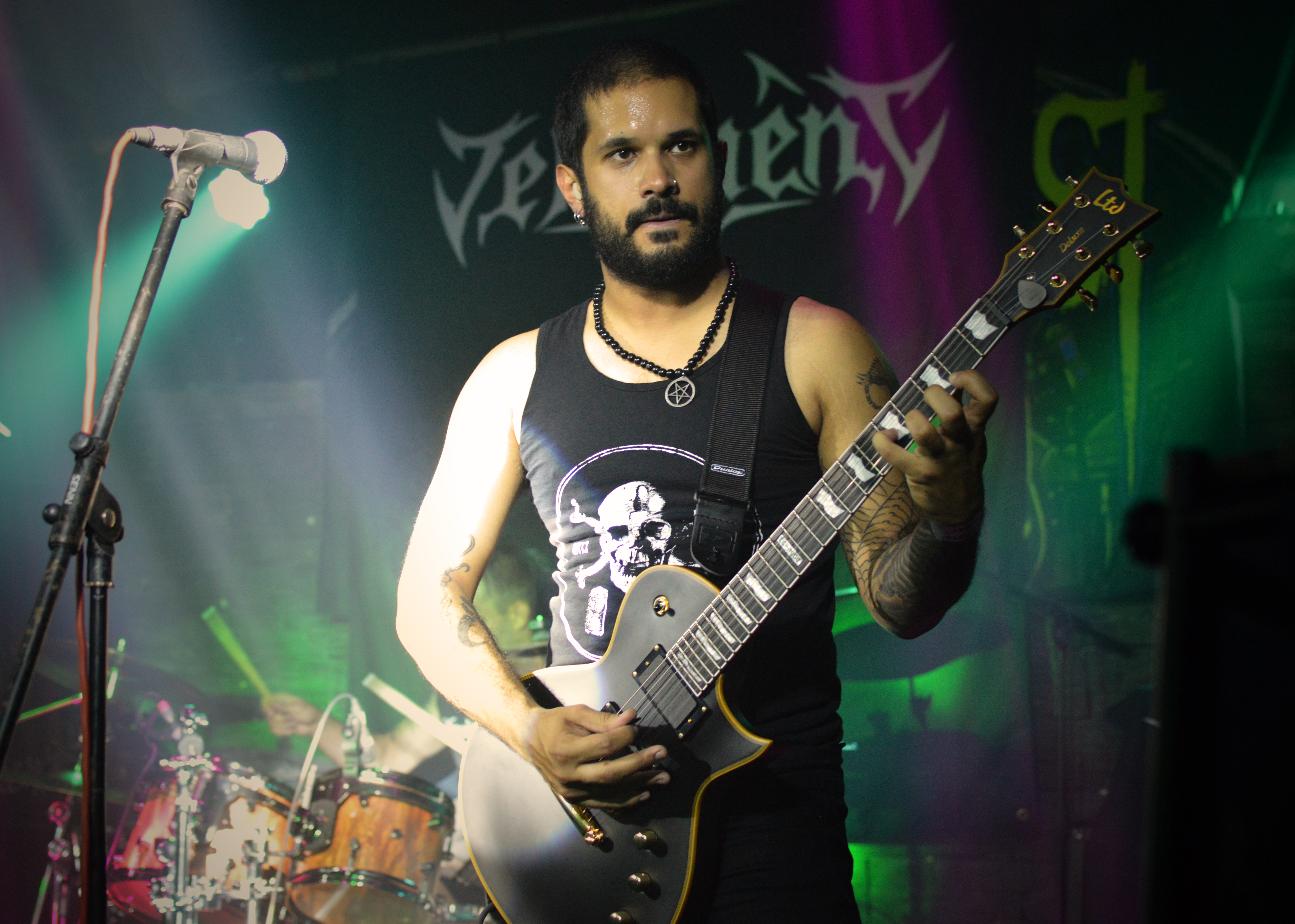 First off, a couple of confessions: Although Mammothfest had more than one stage, the representatives of The Metal Observer, including honorary reviewer and artist Paul Gibbinson – yes, he who created the awesome picture accompanying this article – spent the entirety of Friday evening at Brighton’s The Arch watching the Main Stage. As demonstrated by opening band Vehement’s drummer and guitarist sweating profusely after their first track, it was like a sauna in The Arch and the Rikstock stage upstairs was even hotter. There was every chance that it could may have induced fainting in your obese, middle-aged reviewers … it’s not very metal, but that’s our excuse and we’re sticking to it. And second, although we’ve both owned some Rotting Christ albums over the years, it is some time since we’d listened to them and with no setlist available there may be one or two errors/omissions in the song titles in that part of the review.